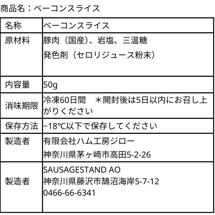 ③ ベーコンスライス(50g) 直火式スモークの香りが食欲をそそる逸品。**実は「レア」で焼くのが一番美味しい食べ方。**あえて焼きすぎず、自慢の脂がとろけ出した瞬間を頬張ってください。